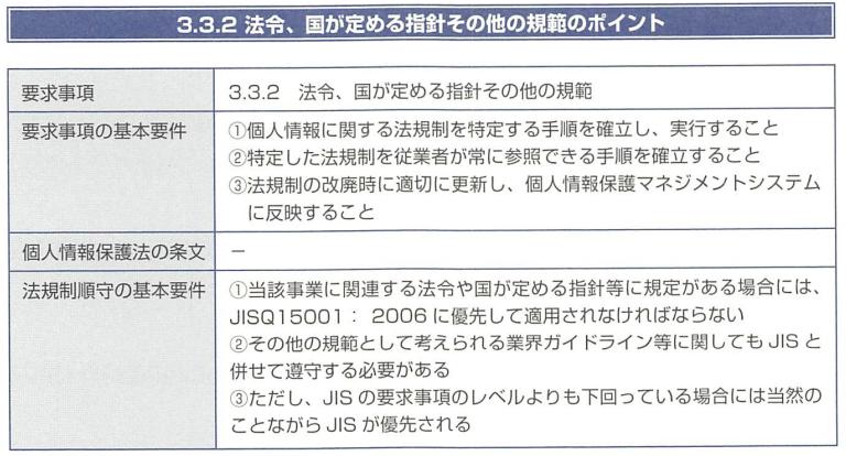 「3.3.2 法令、国が定める指針その他の規範」では「個人情報保護関連法令及び事業者が関係する規範」を特定する手順の策定と維持を要求しています。